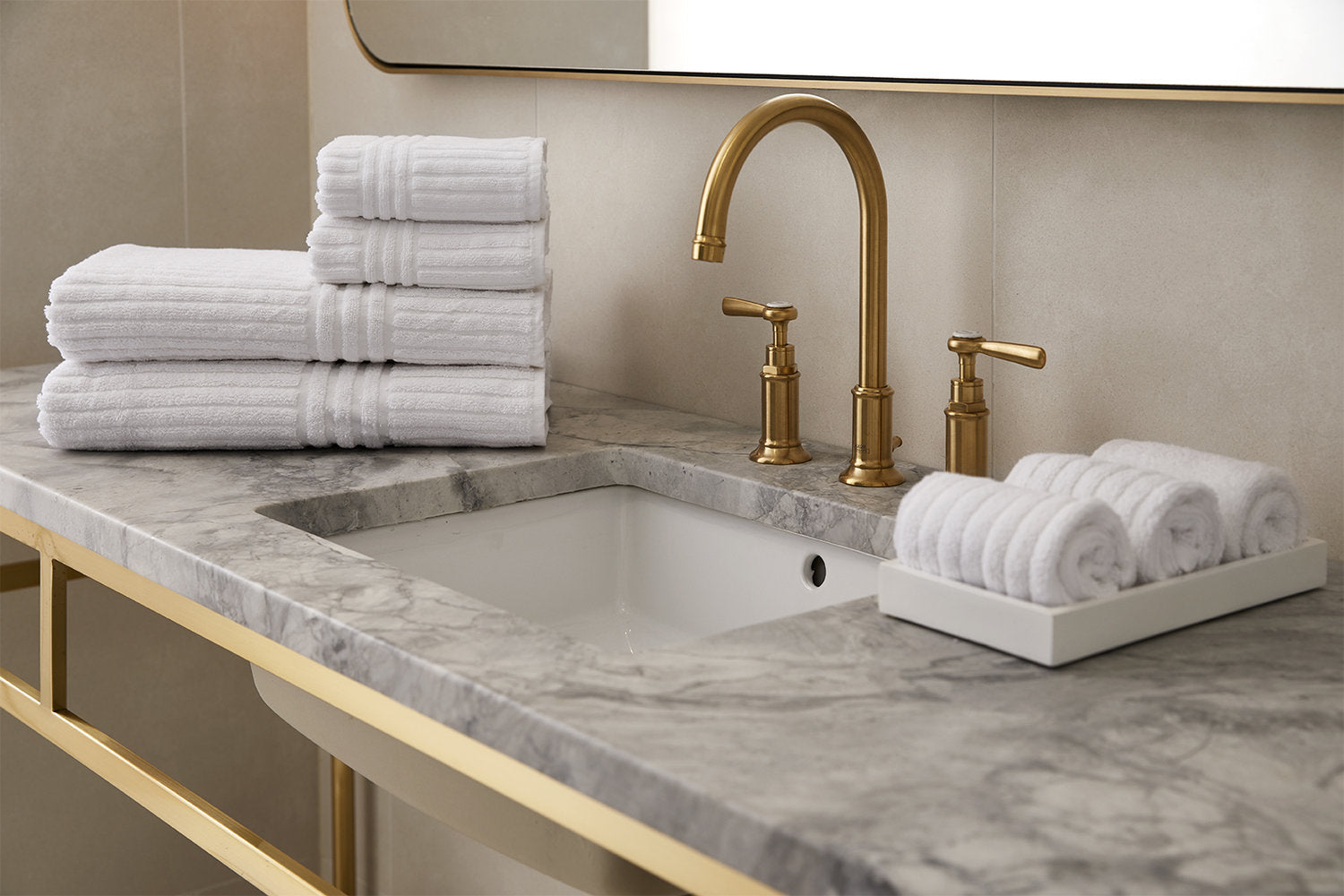 Moisture-wicking cotton terry woven into a stylish and cozy pattern of contrasting pinstripes.